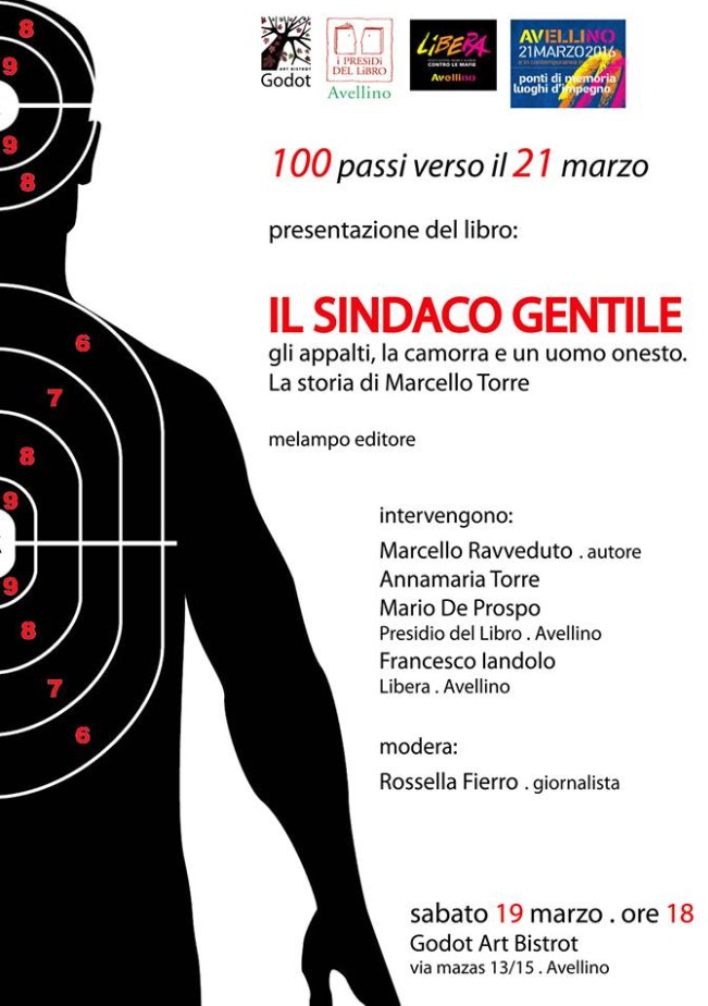 AVELLINO – Presso il Godot bistrot Art di via Mazas è in programma domani, alle 18.00, nell’ambito dei 100 Passi verso il 21 marzo, la presentazione a cura di Libera e del Presidio del libro di Avellino del libro "Il sindaco gentile. Gli appalti, la camorra e un uomo onesto. La storia di Marcello Torre" (Melampo Editore).