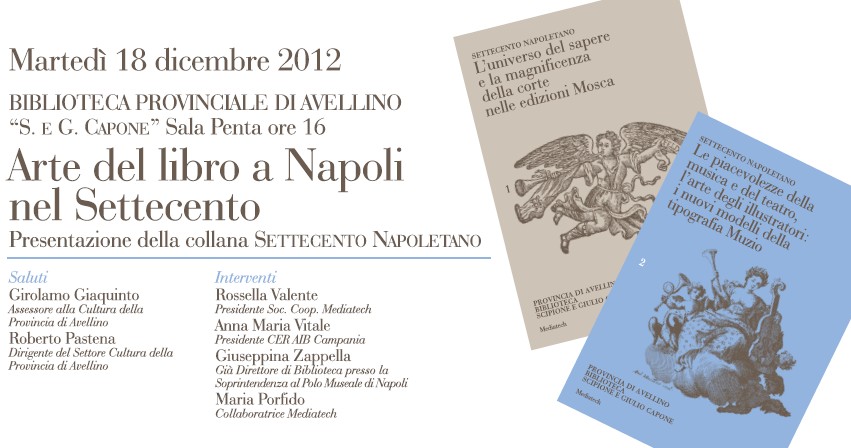 AVELLINO – È in programma domani, con inizio alle ore 16.00, presso la sala Penta della biblioteca provinciale “Scipione e Giulio Capone” la presentazione dei primi due volumi della collana Settecento napoletano Arte del libro a Napoli nel Settecento. Viaggio nella stampa napoletana del Settecento attraverso l’esplorazione delle opere stampate dai tipografi Mosca e Muzio, possedute dalla biblioteca di Corso Europa.