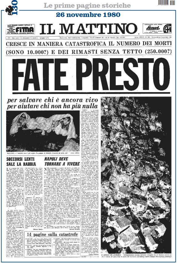 AVELLINO – Ha riscosso il favore dei lettori della Campania, ma soprattutto irpini, l'iniziativa del Mattino di ripubblicare oggi la prima pagina del quotidiano con il famoso titolo “FATE PRESTO”. Un titolo che “parlava” nell'edizione del 26 novembre 1980 del Mattino, con un richiamo grande e forte, tutto in carattere maiuscolo, per denunciare i gravissimi ritardi nei soccorsi delle popolazioni campane e lucane colpite dal disastroso terremoto. Un titolo talmente d'impatto che ispirò il re della pop art, Andy Warhol, che ne fece un'opera d'arte (tra l'altro proprio domani, a Napoli, si inaugura al Pan una mostra dal titolo “Andy is back”, Andy è tornato, per celebrare lo speciale rapporto che Warhol ebbe con Napoli attraverso l'amicizia con Lucio Amelio: tra le varie sezioni della rassegna anche una dedicata a “Fate presto” e al Mattino).