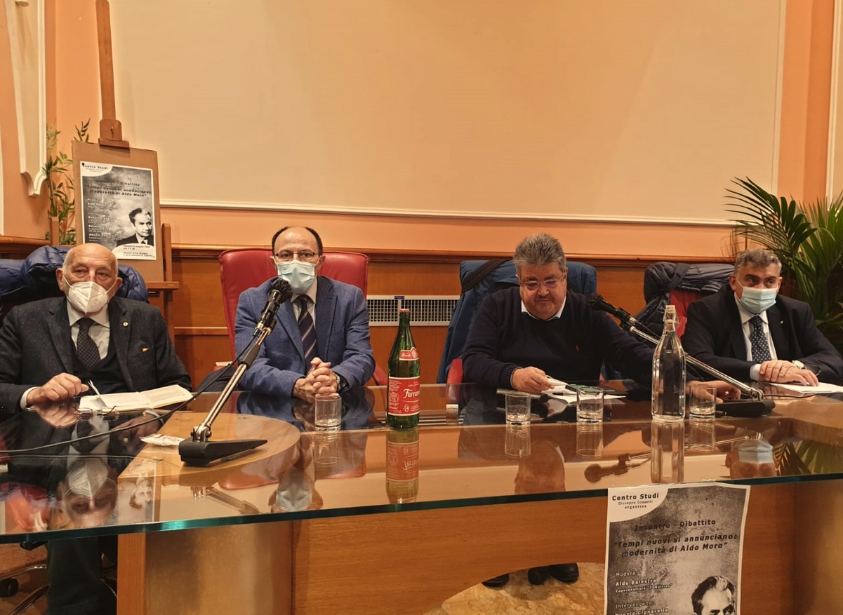 AVELLINO – Il ricordo di una figura come quella di Aldo Moro, in concomitanza con il 44° anniversario della sua morte (avvenuta a Roma il 9 maggio del 1978, per mano delle Brigate Rosse che lo avevano rapito a marzo uccidendo gli uomini della sua scorta), è stato sicuramente testimonianza di riconoscenza ed affetto nei confronti di uno dei più importanti uomini della politica italiana. Lo ha fatto ad Avellino il Centro studi “Giuseppe Dossetti”, in un convegno che si è tenuto al circolo della stampa sul tema “Tempi nuovi si annunciano: modernità di Aldo Moro”.