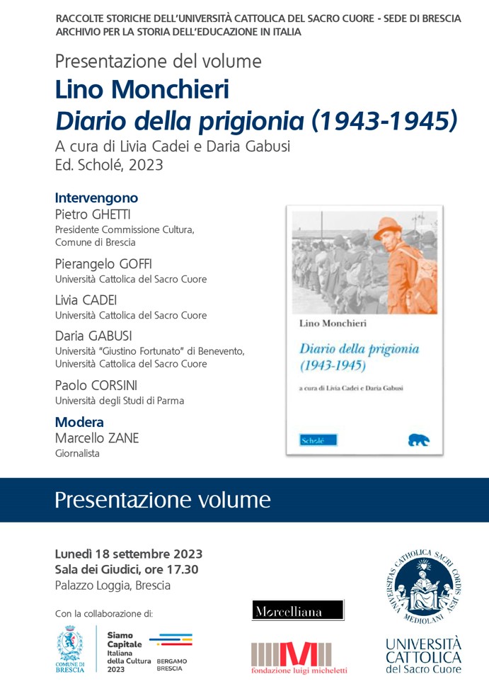 BRESCIA – Le Raccolte Storiche dell'Università Cattolica del Sacro Cuore (Sede di Brescia) e l'Archivio per la Storia dell'educazione in Italia organizzano la presentazione del volume "Lino Monchieri. Diario della prigionia (1943-1945)", a cura di Livia Cadei e Daria Gabusi (Ed. Scholé, 2023).