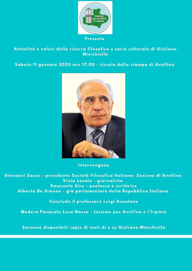 More images...Aggiornamento del 10 gennaio 2025, ore 12.10 – "Attualità e valori della ricerca filosofica e politico-culturale di Giuliano Minichiello": questo il tema del convegno che il movimento politico-culturale "Insieme per Avellino e l'Irpinia" ha promosso in occasione del terzo anniversario della scomparsa, avvenuta il 23 gennaio 2022, di questo nostro illustre concittadino, professore ordinario di Pedagogia e filosofia dell'educazione dell'università di Salerno.