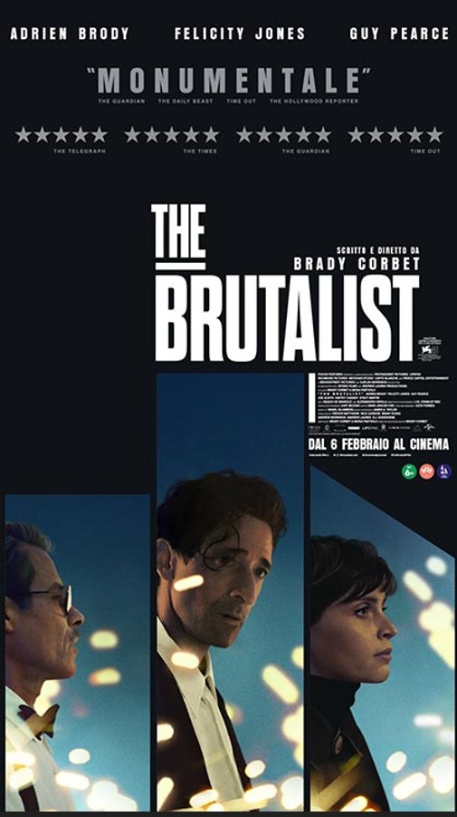 AVELLINO – Se è stato definito opera-monstre non è solo per le proporzioni: tre ore e mezza di proiezione, con un intervallo di un quarto d’ora, quasi un decennio perché il regista e la cosceneggiatrice Mona Fastvold, sua moglie, trovassero i luoghi in Ungheria dove ambientare una storia americana, perché il musicista Daniel Blumberg creasse una colonna sonora insieme incombente e brutale come le vicende narrate e la scenografa Judy Becker completasse la sua ricerca filologica sull’architettura e l’arredamento brutalisti per poter inventare gli edifici e gli interni attribuiti all’architetto immaginario László Tóth (un grande Adrien Brody), ebreo ungherese fuggito negli States dopo aver subito il campo di concentramento di Buchenwald.