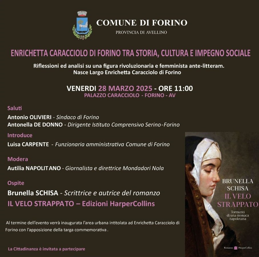Alla presenza di autorità istituzionali e scolastiche, nonché di alcune classi della scuola secondaria di I grado di Forino, sarà ospite Brunella Schisa, giornalista de “La Repubblica” ed autrice del romanzo Il velo strappato, ed. HarperCollins, interamente dedicato alla vita di Enrichetta. Il suo intervento darà modo ai partecipanti di scoprire le sfumature e i significati più profondi del libro, che affonda le radici in un'analisi storica e sociale di grande impatto. Il velo strappato affronta temi legati alla lotta per la libertà e all'emancipazione, portando alla luce la forza interiore di personaggi che, pur vivendo in periodi difficili, riescono a infrangere le barriere della tradizione e della repressione. L'incontro con l'autrice sarà un'opportunità per i lettori e gli appassionati di cultura di entrare nel cuore del romanzo, scoprendo il dietro le quinte della sua creazione e i messaggi che l'autrice ha voluto trasmettere attraverso le sue parole.