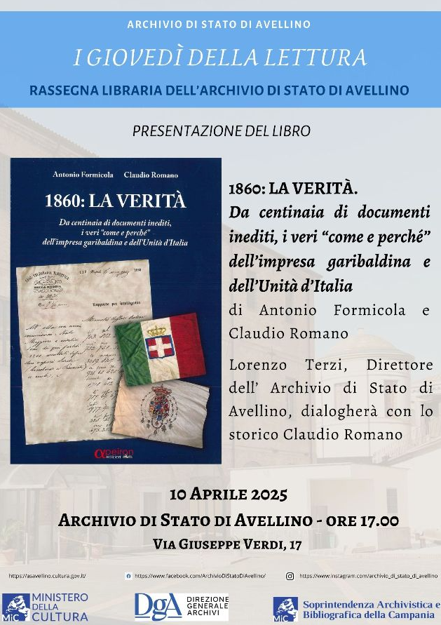 In tale occasione si presenterà il volume 1860: la verità. Da centinaia di documenti inediti, i veri “come e perché” dell’impresa garibaldina e dell’Unità d’Italia, di Antonio Formicola e Claudio Romano. La presentazione sarà introdotta da Lorenzo Terzi, direttore dell’Archivio di Stato di Avellino, che dialogherà con uno degli autori, lo storico Claudio Romano. L’ingresso è libero.