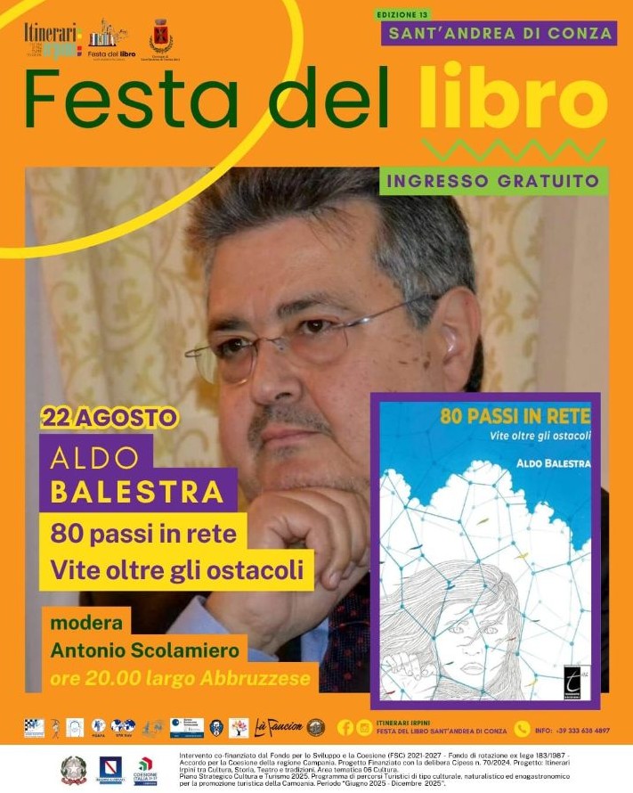 SANT’ANDREA DI CONZA – Nell’ambito della XIII edizione della Festa del libro di Sant’Andrea di Conza, venerdì 22 agosto alle 20.00, verrà presentato il volume “80 passi in rete. Vite oltre gli ostacoli” di Aldo Balestra, pubblicato da Terebinto Edizioni.