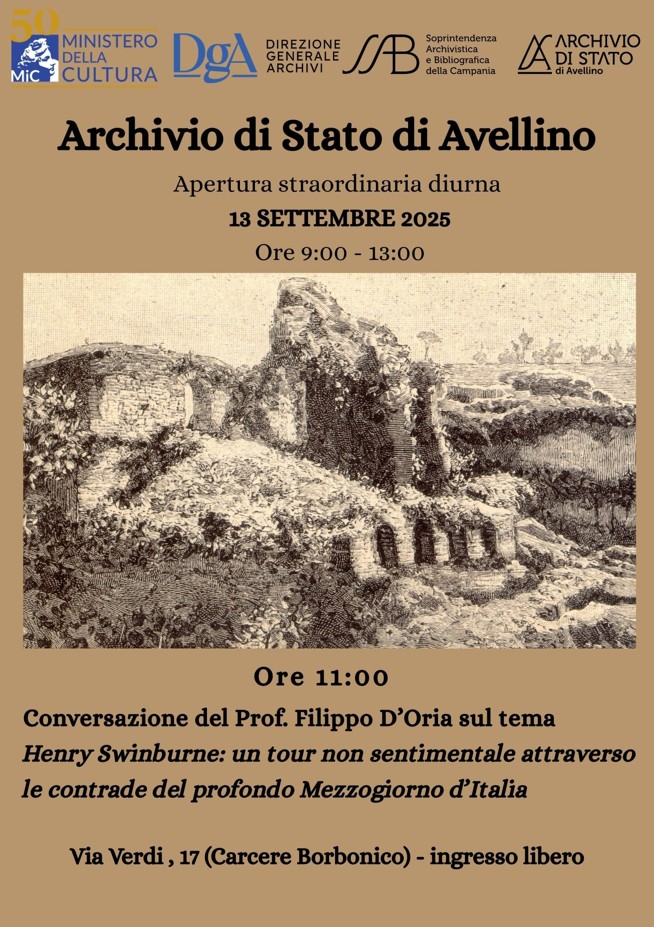 Alle ore 11:00 il prof. Filippo D’Oria, già docente di Paleografia presso l’Università degli Studi di Napoli “Federico II”, terrà una conversazione sul tema Henry Swinburne: un tour non sentimentale attraverso le contrade del profondo Mezzogiorno d’Italia. L’ingresso è libero.