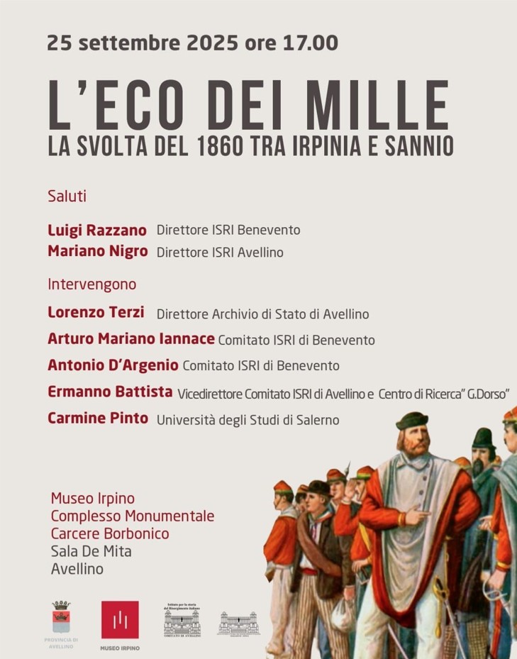 AVELLINO – I comitati di Avellino e di Benevento dell'Istituto per la storia del Risorgimento italiano sono lieti di comunicare lo svolgimento dell'evento in programma ad Avellino giovedì 25 settembre, intitolato “L’eco dei Mille. La svolta del 1860 tra Irpinia e Sannio”, realizzato in collaborazione con il Museo Irpino in relazione al percorso espositivo "Garibaldi, i Mille, l’Italia", allestito presso la sezione Risorgimento del Museo Irpino. L’iniziativa, in programma presso la sala De Mita (ex sala blu) al carcere borbonico, sarà occasione per riflettere su un anno cruciale, il 1860, che segnò profondi mutamenti per l’Italia e in particolare per il Mezzogiorno, analizzando la cosiddetta “Rivoluzione meridionale” e il suo impatto sul nostro territorio attraverso le relazioni di autorevoli studiosi.