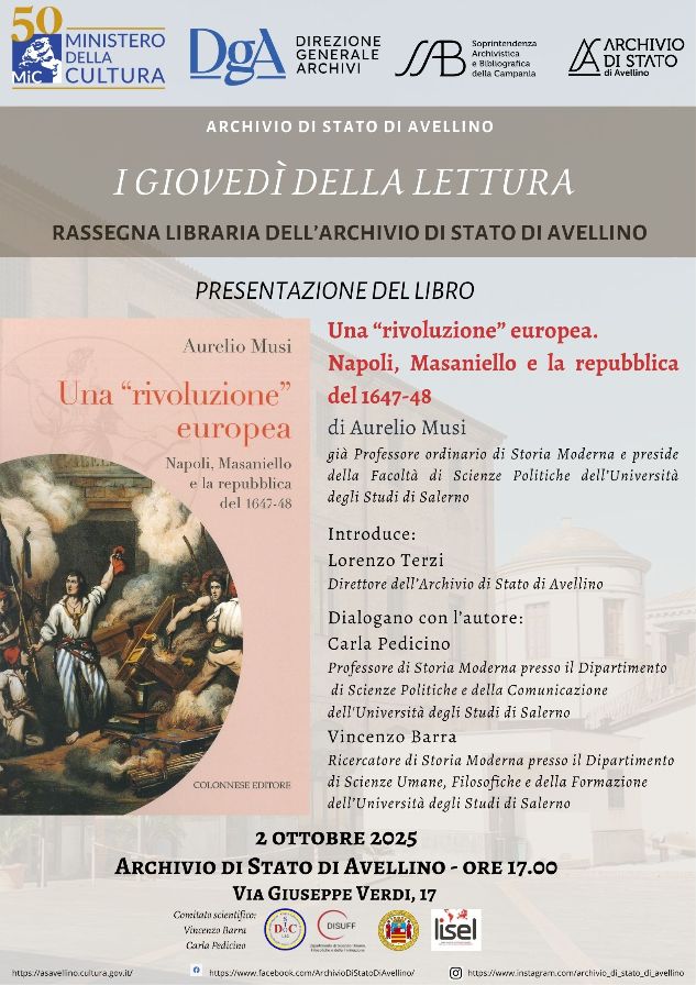AVELLINO – Giovedì 2 ottobre prossimo, alle ore 17:00, si terrà un nuovo, imperdibile appuntamento della rassegna libraria dell’Archivio di Stato di Avellino “I giovedì della lettura”. Sarà presentato il volume di Aurelio Musi “Una rivoluzione europea. Napoli, Masaniello e la repubblica del 1647-48”.