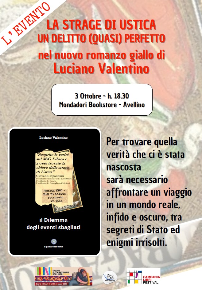 AVELLINO – Arriva ad Avellino Il dilemma degli eventi sbagliati di Luciano Valentino (Balzano Editore), romanzo giallo che intreccia memoria, mistero e storia attorno alla strage di Ustica. Dopo le tappe alla biblioteca nazionale di Cosenza e al Salone internazionale del libro di Torino 2025, il volume sarà presentato giovedì 3 ottobre alle ore 18:00 presso il Mondadori Bookstore di Avellino.