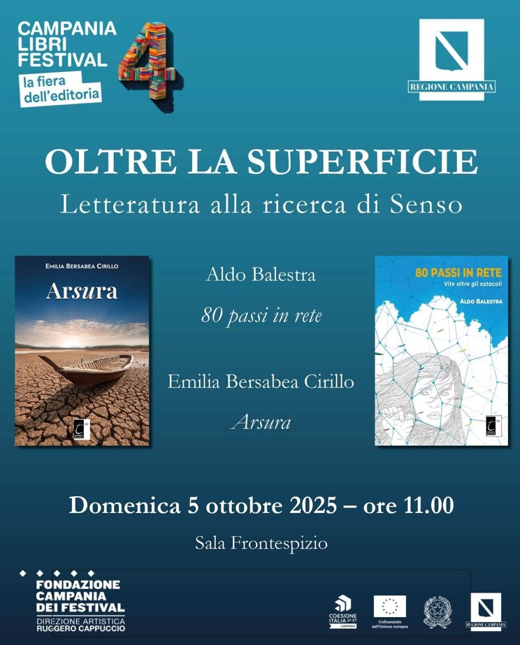 NAPOLI - Nell’ambito del Campania Libri Festival, che animerà il cuore culturale della città partenopea, il Terebinto Edizioni sarà protagonista con l’evento “Oltre la Superficie. Letteratura alla ricerca di Senso”, un incontro-dialogo tra Aldo Balestra ed Emilia Bersabea Cirillo, in programma domenica 5 ottobre 2025, alle ore 11.00, presso il Palazzo Reale di Napoli – Sala Frontespizio. La casa editrice irpina, da sempre impegnata nella valorizzazione della parola come strumento di riflessione civile e ricerca interiore, porta in fiera due opere che esplorano l’umano oltre l’apparenza: 80 passi in rete. Vite oltre gli ostacoli, di Aldo Balestra, e Arsura, di Emilia Bersabea Cirillo.