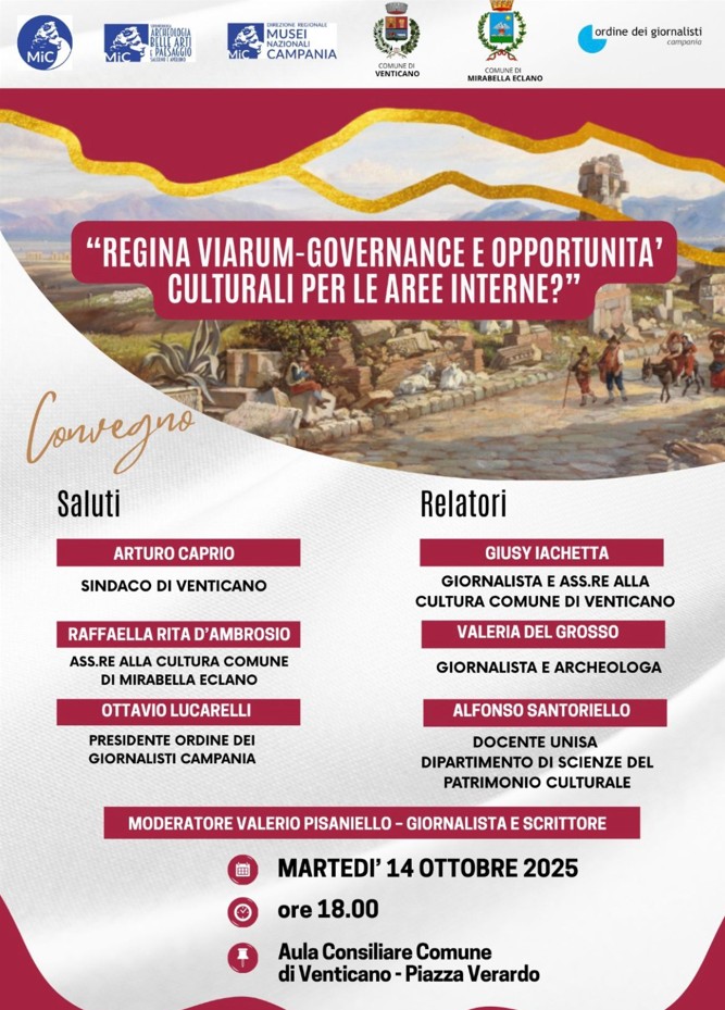VENTICANO - “Regina viarum” - Governance e opportunità culturali per le aree interne?”: questo l’evento che si terrà martedì 14 ottobre, alle ore 18.00, nell'aula consiliare del Comune di Venticano. Un appuntamento dedicato alle strategie di valorizzazione del patrimonio culturale e allo sviluppo sostenibile delle comunità interne.