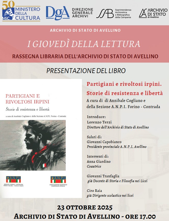 AVELLINO – Giovedì 23 ottobre prossimo, alle ore 17:00, si terrà un nuovo appuntamento della rassegna libraria dell’Archivio di Stato di Avellino “I giovedì della lettura”. In tale occasione si presenterà il volume Partigiani e rivoltosi irpini. Storie di resistenza e libertà, a cura di Annibale Cogliano e della Sezione Anpi Forino - Contrada.