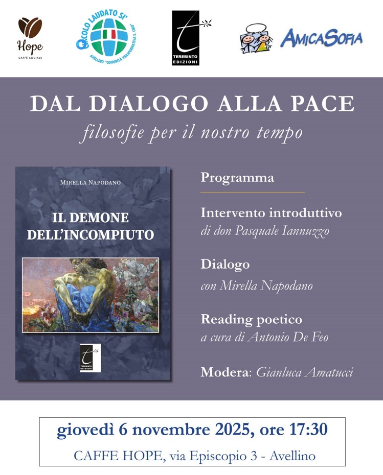 AVELLINO – Un nuovo incontro per riflettere insieme sui grandi temi del nostro tempo: dal dialogo alla pace attraverso le pagine del libro Il demone dell’incompiuto di Mirella Napodano, edito da Il Terebinto Edizioni.