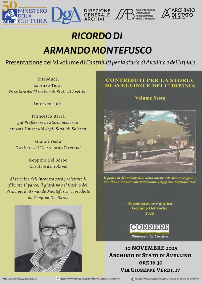 AVELLINO – Lunedì 10 novembre prossimo, alle ore 16:30, si presenterà presso l’Archivio di Stato di Avellino il sesto volume della serie Contributi per la storia di Avellino e dell’Irpinia. In tale occasione verranno ricordate la figura e l’opera del compianto autore, Armando Montefusco.