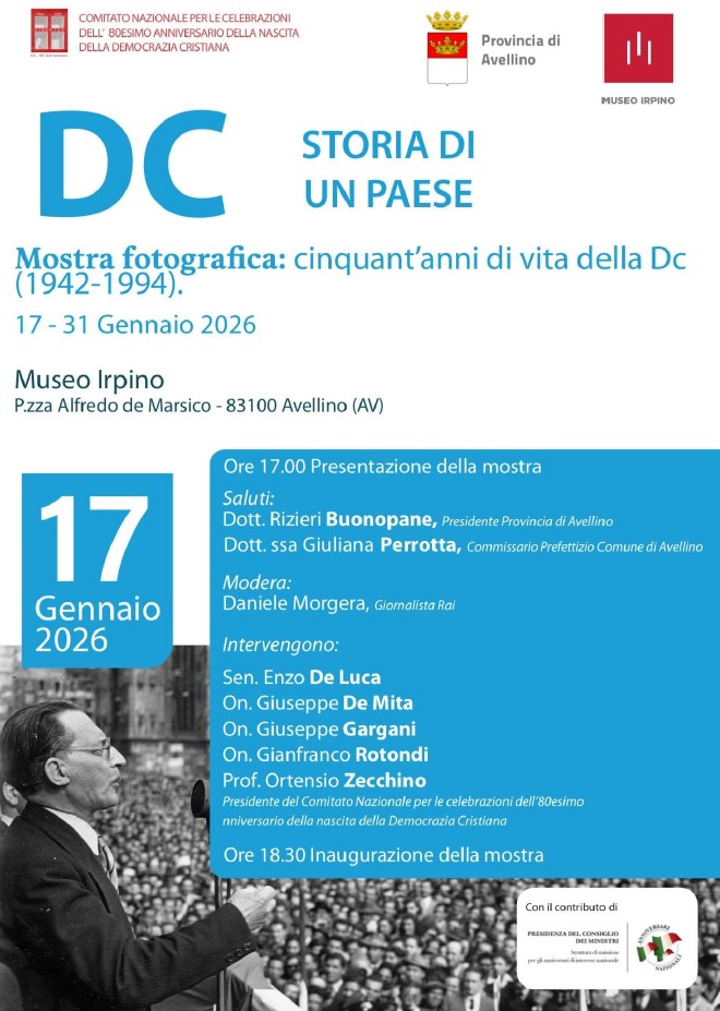 AVELLINO – Sarà Ortensio Zecchino, già senatore della Repubblica e ministro dell’Università e della ricerca scientifica, presidente del comitato nazionale per le celebrazioni dell’80esimo anniversario della nascita della Democrazia Cristiana, a concludere la serie di interventi previsti sabato prossimo, 17 gennaio 2026, in occasione dell’inaugurazione, presso il museo irpino di Piazza Alfredo de Marsico, con inizio alle ore 17.00, della mostra fotografica “Dc, storia di un Paese. Cinquant’anni di vita della Dc (1942-1994).