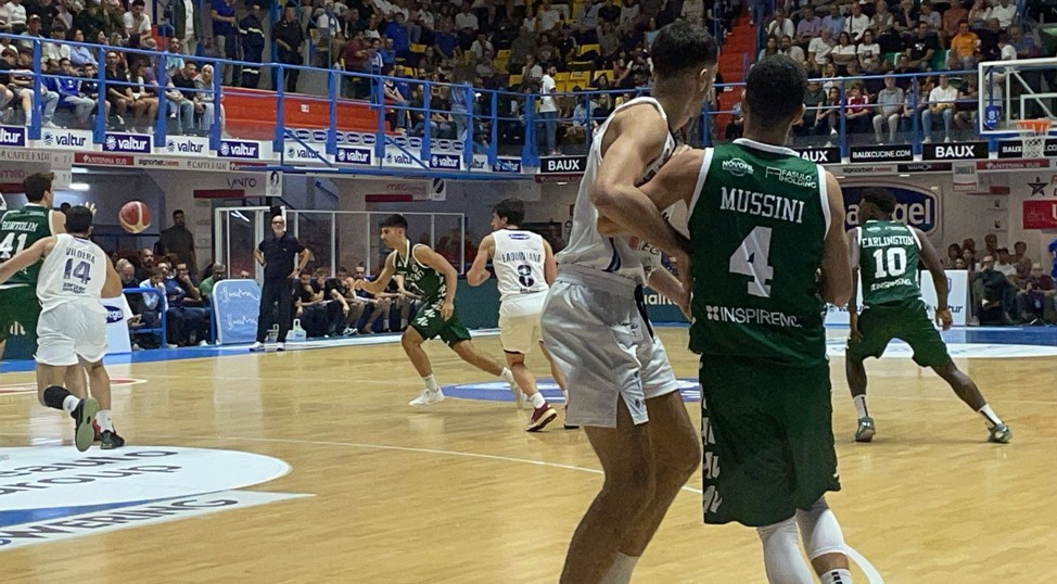 I sette punti di Chinellato in apertura di quarta frazione hanno tenuto a galla i biancoverdi (66/64 al 34’), prima dell’ultimo tentativo di fuga dei padroni di casa (72/64) a 4’20” dal termine. Da allora l’attacco dei padroni di casa ha perso la sua efficacia, mentre per Mussini e compagni è arrivato il momento della gloria, del parziale di 0 a 13 che ha deciso le sorti del match, fissando il punteggio finale sul 72 a 77. Un successo importante, che però deve andare già in archivio perché mercoledì 2 ottobre alle 20 e 30 ci sarà l’esordio casalingo contro la Real Sebastiani Rieti. Un match richiamerà certamente un buon numero di tifosi che si aggiungeranno ai circa 1.000 abbonati.