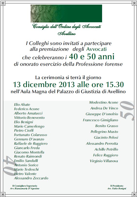 Nel corso della stessa cerimonia saranno premiati per i 40 anni di avvocatura Elio Abate, Federico Acone, Alberto Amatucci, Vittorio Benevento, Elio Benigni, Mario Camerlengo, Pietro Cioffi, Fortunato Colarusso, Gennaro D’Avanzo, Raffaele de Ruggiero, Giancarlo Freda, Giacomo Montella, Renato Raimondi, Emilio Sandulli, Antonio Sorice, Mario Tedeschi, Pietro Valente, Alessandro Zeccardo.