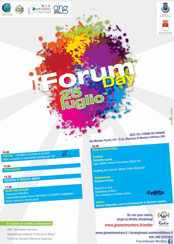 MONTORO INFERIORE – Un’intera giornata dedicata ai giovani, al loro mondo, in particolare alle opportunità offerte dall’Europa, alla promozione del territorio, all’arte e alla musica: tutto questo è al Forum day in programma, mercoledì 25 luglio, alla frazione Misciano di Montoro Inferiore presso la sede del Forum dei giovani.