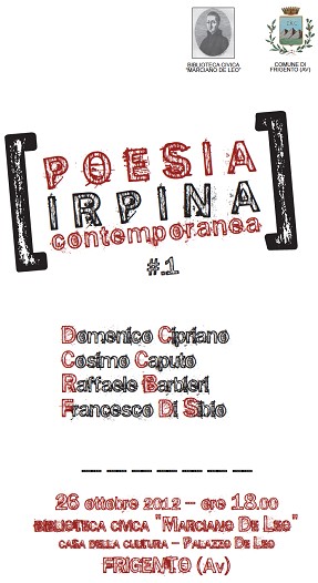 Breve presentazione dei poeti coinvolti - Domenico Cipriano. Nato nel 1970 a Guardia Lombardi. Nel 2000 ha pubblicato la raccolta di poesie Il continente perso (premio Camaiore proposta lo stesso anno) con la prefazione di Plinio Perilli e una nota del musicista jazz Paolo Fresu. Interessato al connubio tra le arti, in particolare al legame tra musica e poesia, ha realizzato nel 2004, con l’attore Enzo Marangelo e i musicisti Enzo Orefice, Piero Leveratto ed Ettore Fioravanti, il CD di jazz e poesia JPband: Le note richiamano versi (Abeatrecords). Collabora con artisti di vario genere e, nel 2010, ha dato vita al progetto Lampioni, per la sua voce e le musiche degli “Elettropercutromba”. Sempre nel 2010 ha pubblicato il poemetto Novembre (edito da Transeuropa), con la prefazione del prof. Antonio La Penna. Il libro, ispirato al sisma del 1980, è stata incluso nella rosa finalista del premio Viareggio-Répaci 2011. È redattore di Sinestesie e ha ideato la rassegna “Le strade della poesia” a Guardia Lombardi. È uno dei curatori della collana di cataloghi foto-poetici Pietre Vive.
