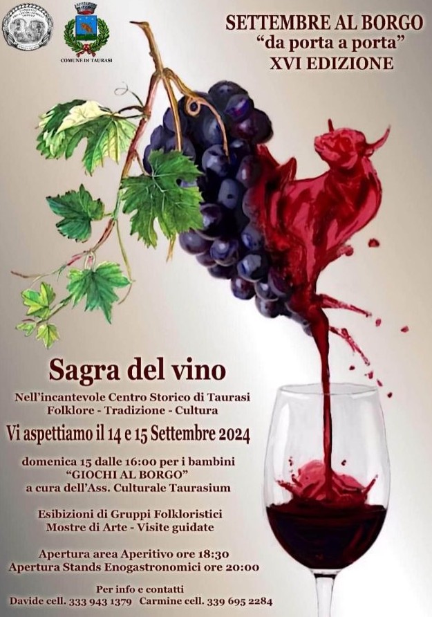 Il Comitato “Pro Centro Storico”, con il patrocinio del Comune di Taurasi, ha organizzato per sabato 14 e domenica 15 settembre 2024 la sedicesima edizione della manifestazione di enogastronomia, spettacoli e arte, ideata nel lontano 1983 dal compianto sindaco dell’epoca, il professor Piero Camuso. L’allora primo cittadino del paese irpino della Media Valle del Calore fu uno dei precursori di un nuovo modello di salvaguardia e di vera promozione delle risorse agricole, artistiche e paesaggistiche del territorio. Camuso ebbe la grande intuizione di aprire realmente le porte dell’incantevole centro storico di Taurasi, dove migliaia di visitatori entrarono per la prima volta in contatto diretto con i prodotti tipici dell’enogastronomia e dell’artigianato locale, e con lo straordinario patrimonio culturale e storico dell’antica tradizione contadina irpina.