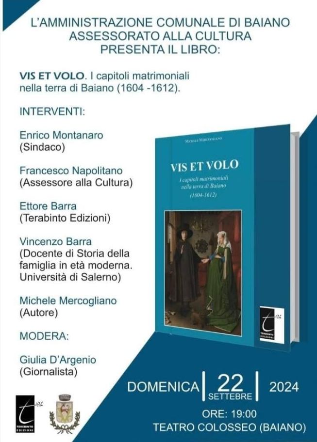 BAIANO – L'amministrazione comunale di Baiano con l'assessorato alla Cultura presenta il libro "Vis et volo" I capitoli matrimoniali nella terra di Baiano (1604/1612). L'evento domenica 22 settembre 2024, alle 19.00, nel Teatro Colosseo di Baiano.