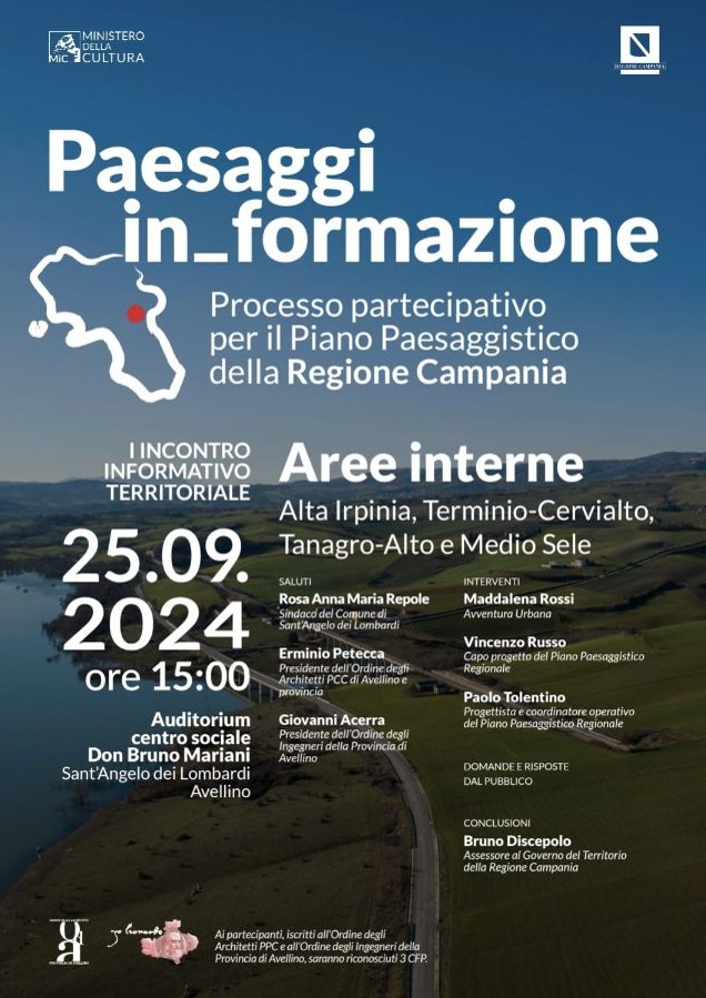 SANT’ANGELO DEI LOMBARDI – Prende ufficialmente il via il processo partecipativo per la definizione del Piano paesaggistico regionale della Regione Campania, frutto della collaborazione con il ministero della Cultura. Il primo incontro pubblico informativo, intitolato "Paesaggi in_formazione" si terrà mercoledì 25 settembre 2024, alle ore 15, presso l'auditorium del centro sociale Don Bruno Mariani a Sant'Angelo dei Lombardi.