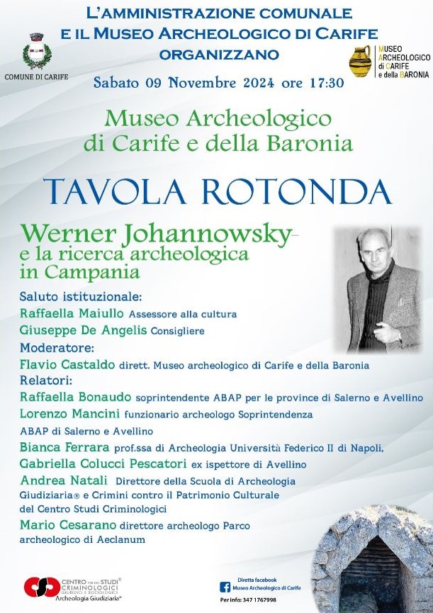 Numerosi i relatori alla tavola rotonda sul tema “Werner Johannowsky e la ricerca archeologica in Campania”. A moderare l’incontro sarà Flavio Castaldo, direttore del Museo archeologico di Carife e della Baronia. Per i saluti istituzionali interverranno Raffaella Maiullo, assessore alla Cultura e Giuseppe De Angelis, consigliere comunale.