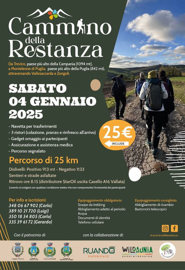 La partenza è prevista il 4 gennaio 2025, alle ore 9.00, dal centro storico di Trevico ove i partecipanti arriveranno mediante un servizio navetta che dall’uscita del casello autostradale di Vallata farà la spola con il paese più alto della Campania. La quota di iscrizione è di 25€ (che scendono a 15€ per gli under 15) e comprende fra l’altro anche un servizio navetta per i tratti più impegnativi.