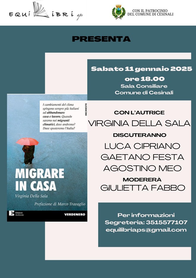 CESINALI – L’associazione Equilibri Aps che da anni cura la rassegna letteraria “Un libro al mese”, una kermesse dedicata alla promozione delle opere letterarie dei più amati, apprezzati e promettenti autori locali, ormai alla quarta edizione, rende noto che presenterà l’opera editoriale “Migrare in casa”, di Virginia Della Sala, giornalista de Il Fatto quotidiano ed originaria proprio di Cesinali.