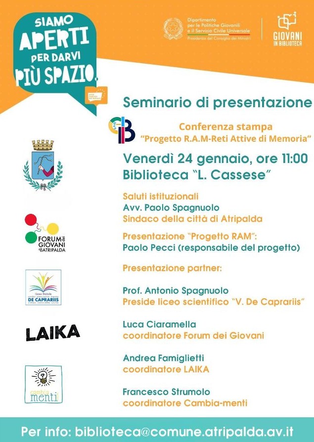 Il Comune di Atripalda, in collaborazione con i partner del progetto “Ram-Reti attive di memoria” (Forum dei Giovani di Atripalda, Liceo scientifico “Vittorio De Caprariis”, Laika e Cambia-menti), punterà a rendere la biblioteca comunale “Leopoldo Cassese” più attrattiva favorendo la partecipazione attiva dei più giovani.