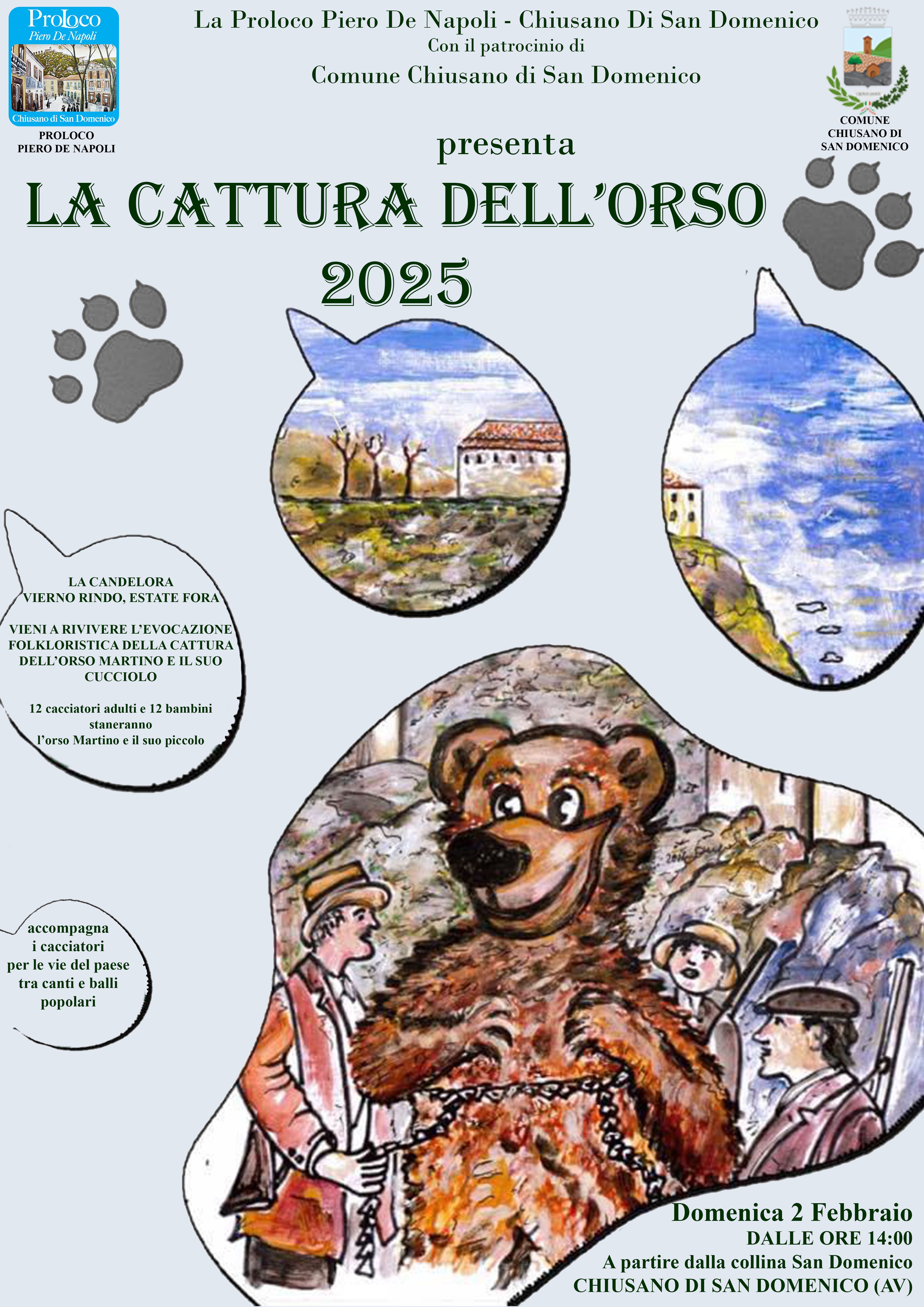 CHIUSANO SAN DOMENICO – Domenica 2 febbraio 2025, a partire dalle ore 14.00, si terrà la tradizionale manifestazione de “La cattura dell’orso”, organizzata dalla Proloco Piero De Napoli e patrocinata dal Comune di Chiusano San Domenico. A partire dalla collina San Domenico il corteo si snoderà per le strade del paese tra canti e balli popolari.
