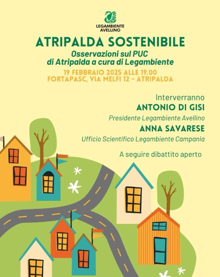 ATRIPALDA – Legambiente Avellino invita tutti i cittadini a partecipare all'assemblea pubblica "Atripalda sostenibile" che si terrà venerdì 19 febbraio 2025 alle 19 presso il circolo Arci Fortapasc di via Melfi 12.