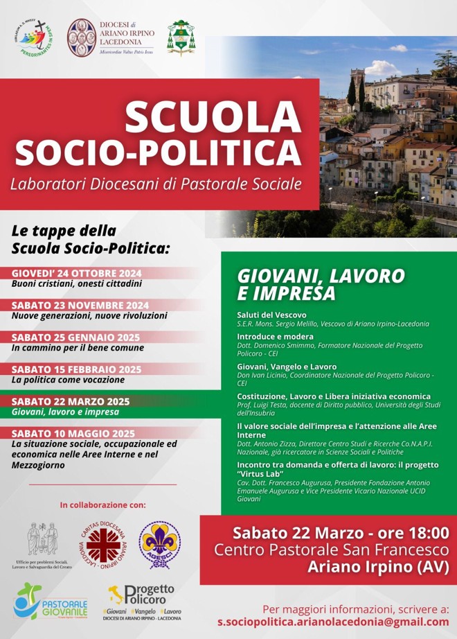 ARIANO IRPINO – Al via domani, sabato 22 narzo, con inizio alle ore 18:00, presso il Centro pastorale San Francesco di Ariano Irpino, i laboratori di diocesani della scuola socio-politica sul tema “Giovani, lavoro e impresa”.