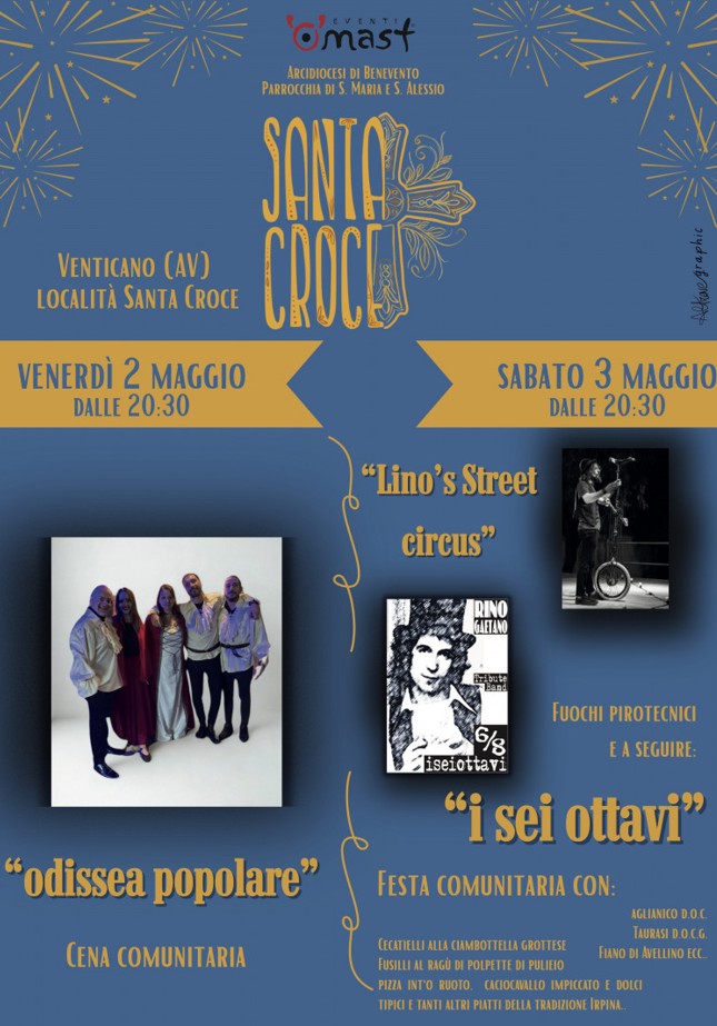VENTICANO - La comunità di Venticano, in località Santa Croce, si prepara a vivere due serate all’insegna della tradizione, della musica e dell’enogastronomia. Venerdì 2 e sabato 3 maggio, a partire dalle ore 20:30, si terrà la tradizionale Festa di Santa Croce, un appuntamento organizzato dal comitato Santa Croce 2025 con la progettazione artistica di Omast Eventi.