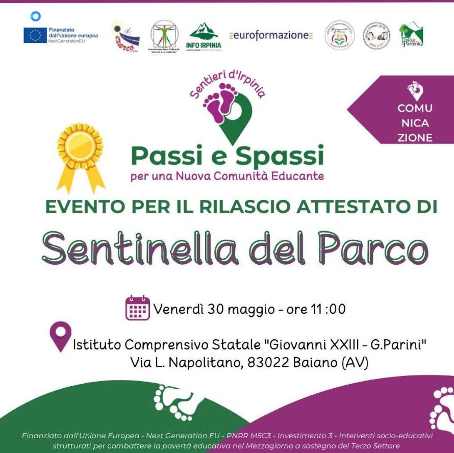 BAIANO – Nuova tappa di “S.E.n.T.I.e.R.I. d’Irpinia- Passi e spassi per una nuova comunità educante”, il progetto finanziato dall'Unione europea - Next Generation Eu - Pnrr M5C3 - Investimento 3 - Interventi socio-educativi strutturati per combattere la povertà educativa nel Mezzogiorno a sostegno del Terzo settore: venerdì 30 maggio 2025, con inizio alle ore 11.00, presso l’istituto comprensivo statale “Giovanni XXIII - Giuseppe Parini” a Baiano, saranno consegnati gli attestati di “Sentinella del Parco” a 154 giovani d’età compresa tra gli 11 e 17 anni.