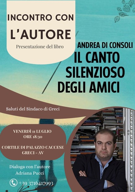 More images...GRECI – La splendida cornice di Palazzo Caccese, a Greci, ospiterà il giornalista e scrittore Andrea Di Consoli in occasione della presentazione del suo ultimo romanzo “Il canto silenzioso degli amici” (edito da Rubbettino). L’appuntamento è per venerdì prossimo alle 18:30.