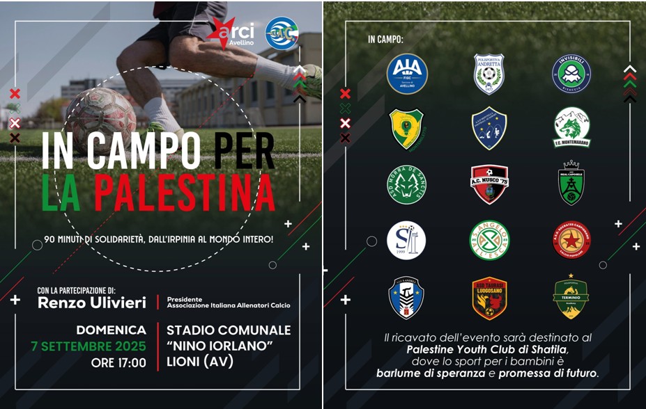 Così, domenica 7 settembre, 14 squadre irpine scenderanno in campo allo stadio “Nino Iorlano” di Lioni per un evento raro nel panorama calcistico italiano: prendere posizione contro il genocidio di civili, donne, bambini in Palestina e denunciare la tragedia umanitaria che si sta consumando a Gaza.