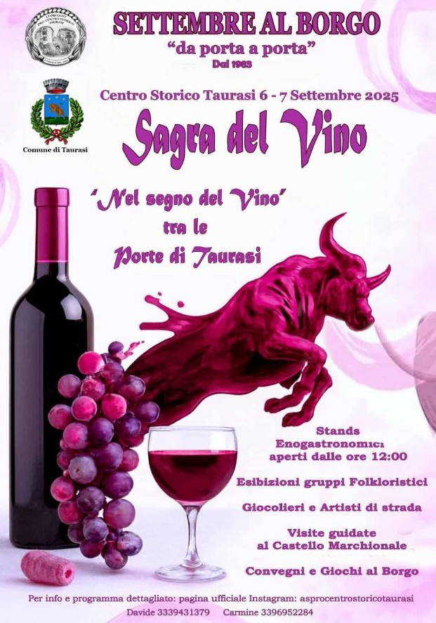 “Nel segno del vino tra le porte di Taurasi”, questo lo slogan per l’edizione 2025 della sagra del vino, organizzata da decenni dal comitato Pro Centro Storico in collaborazione con il Comune di Taurasi.