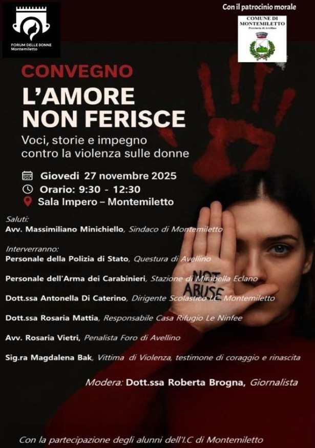 Giovedì 27 novembre 2025, presso la sala Impero di Montemiletto, dalle 9:30 alle 12:30, si terrà l’incontro dal titolo “L’amore non ferisce”- Voci, storie e impegno contro la violenza sulle donne, organizzato dal Forum delle donne con il patrocinio del Comune di Montemiletto.