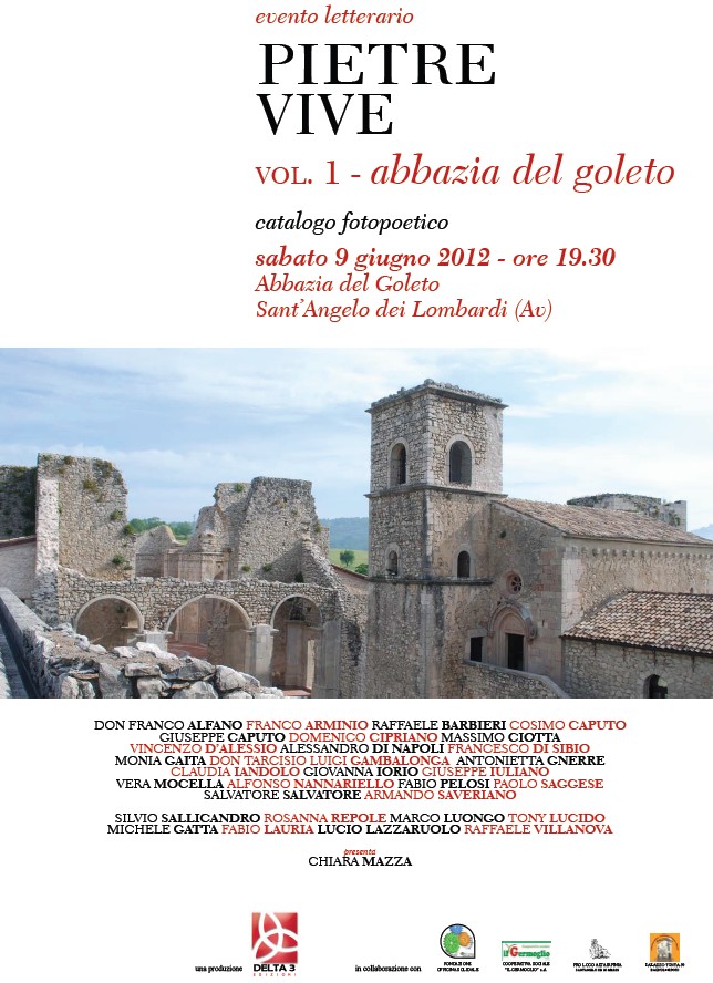 SANT’ANGELO DEI LOMBARDI – Dedicato al complesso monumentale dell’abbazia del Goleto il primo volume di Pietre vive, la collana curata da Massimo Ciotta, Domenico Cipriano e Francesco Di Sibio, che ospita cataloghi sui siti storici dell’Irpinia realizzati con poesie e foto. Il volume, come da noi annunciato, sarà presentato domani sera, con inizio alle ore 19.30, presenti quanti hanno contribuito alla realizzazione, nello splendido scenario della settecentesca chiesa del Vaccaro, il cuore del Goleto.