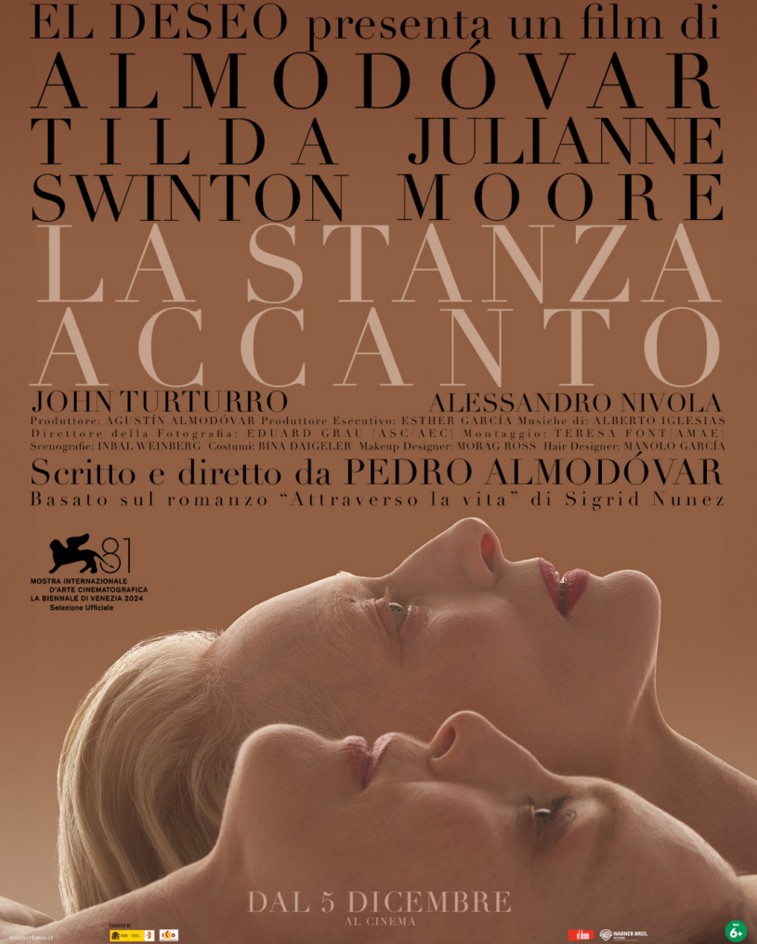 Le due protagoniste dell’ultima pellicola, delicata e drammatica, di Pedro Almodóvar, La stanza accanto, vivono la consapevolezza della morte secondo modalità diverse, che pure le uniranno per sempre: Martha è allo stadio finale di un cancro alla cervice, Ingrid ha appena pubblicato un libro di successo, al centro del quale c’è il suo terrore della morte. Paradossalmente (e i paradossi sono sempre stati una cifra dello stile del regista spagnolo) è proprio la donna condannata a convincere la riottosa amica a vivere un ultimo periodo di vita assieme, in un luogo luminoso e naturale, affittando una splendida villa nei boschi del Montana (in realtà si trova in Spagna, nei pressi del monastero di San Lorenzo del Escorial). Lì, le voci e i silenzi della natura e la bellezza del paesaggio saranno complici nella decisione di Martha di porre fine alla sua vita per propria volontà, sottraendosi all’ultimo ciclo delle dolorose terapie a cui sta facendo da cavia. Ingrid partecipa con affetto e sensibilità, anche se con timore, alla difficile scelta dell’amica, riuscendo anche a recuperare una sincera amicizia sia con l’antico amante Damian (John Turturro), sia con la figlia di Martha, la cui relazione con lei, reporter di guerra, e con il padre, che non l’ha mai riconosciuta, sembra trovare una nuova dimensione grazie alle scelte della madre.