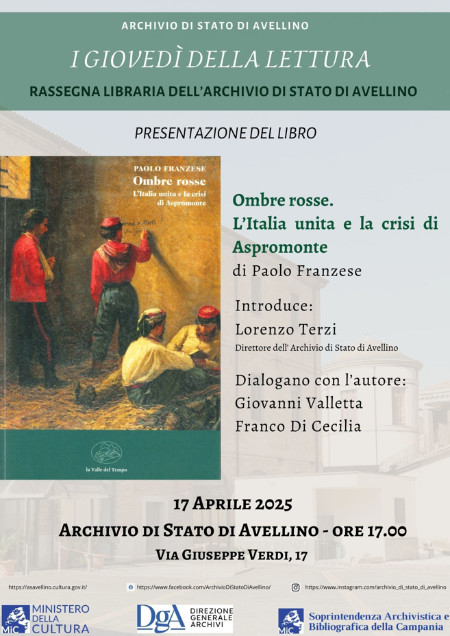 AVELLINO – Giovedì 17 aprile prossimo, alle ore 17:00, si terrà il quarto appuntamento della rassegna libraria dell’Archivio di Stato di Avellino “I giovedì della lettura”. In tale occasione si presenterà il volume Ombre rosse. L’Italia unita e la crisi di Aspromonte, di Paolo Franzese.