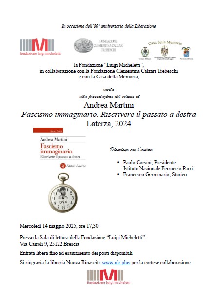 BRESCIA – In occasione dell'80° anniversario della Liberazione, la Fondazione "Luigi Micheletti", in collaborazione con la Fondazione Clementina Calzari Trebeschi e con Casa della Memoria, invita alla presentazione del volume di Andrea Martini "Fascismo immaginario. Riscrivere il passato a destra" (Laterza, 2024).