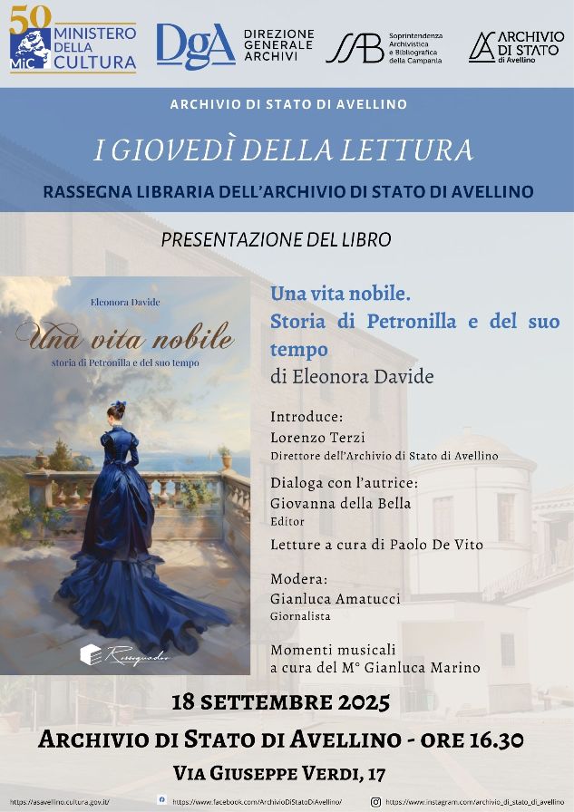 AVELLINO – Giovedì 18 settembre prossimo, alle ore 16:30, avrà inizio la nuova stagione della rassegna libraria dell’Archivio di Stato di Avellino “I giovedì della lettura”. In tale occasione si presenterà il romanzo di Eleonora Davide “Una vita nobile. Storia di Petronilla e del suo tempo”.