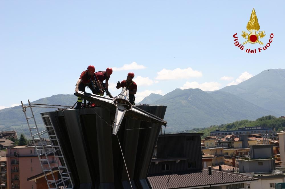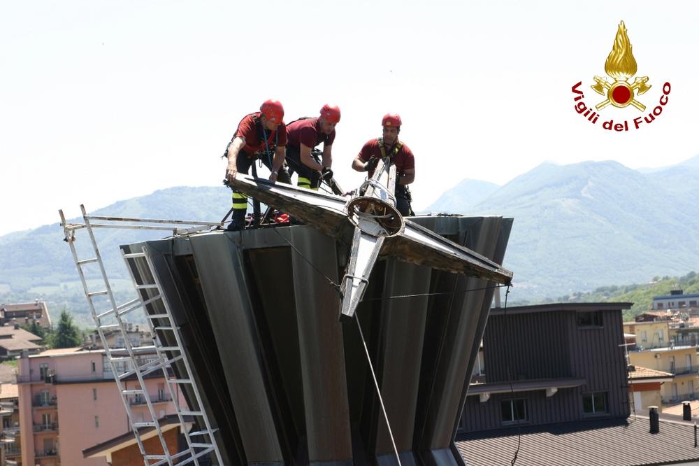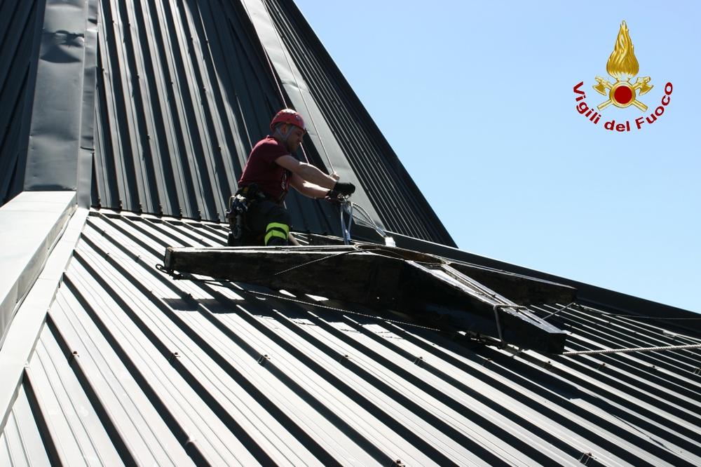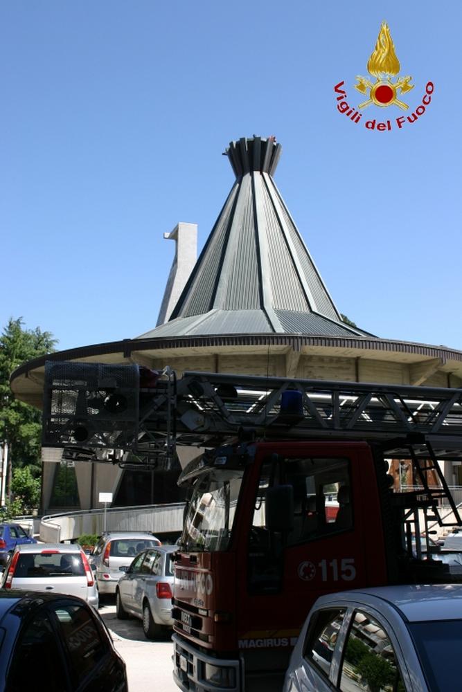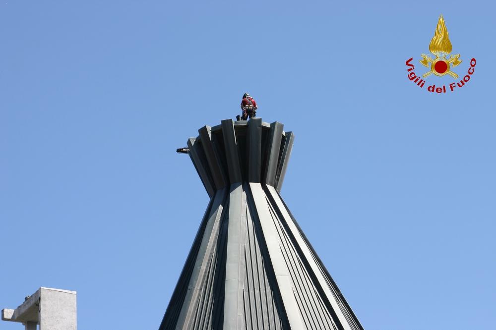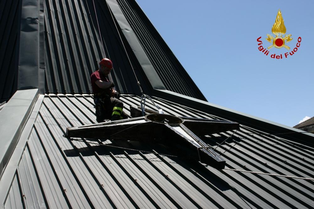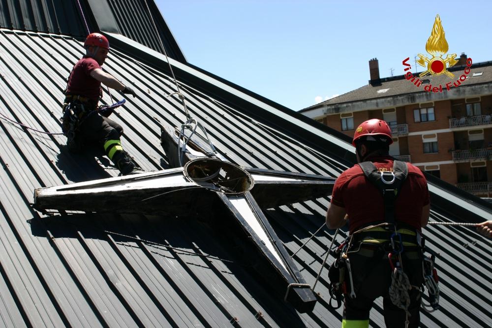 I caschi rossi, dopo aver debitamente provveduto ad imbracare la croce, l’hanno, con gli opportuni accorgimenti, fatta discendere fino a terra per affidarla ad una ditta specializzata per il restauro. Messa in sicurezza la cupola nel punto in cui ospitava la croce.