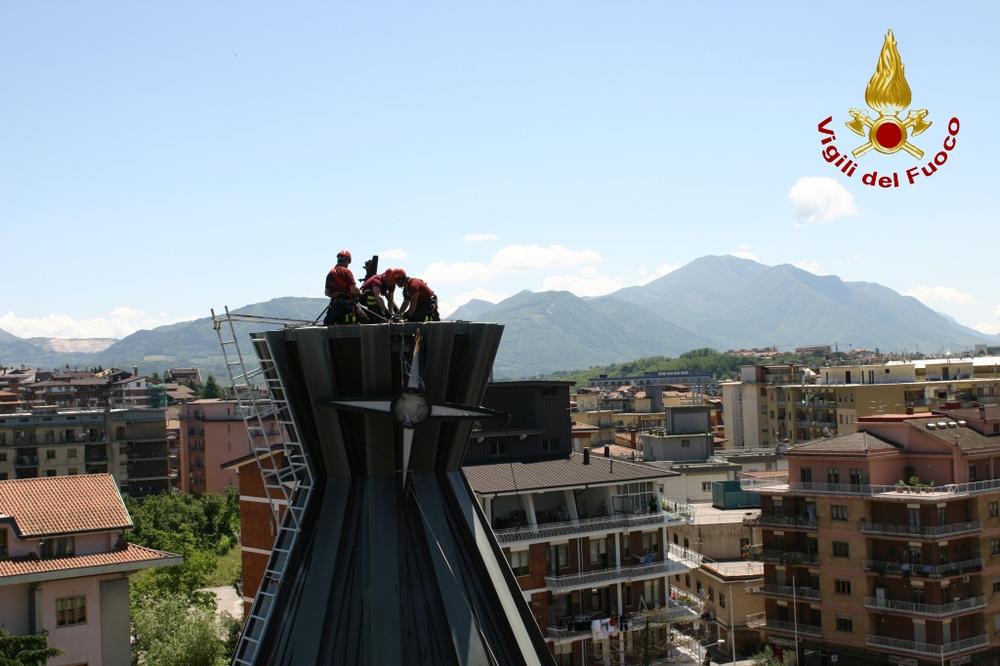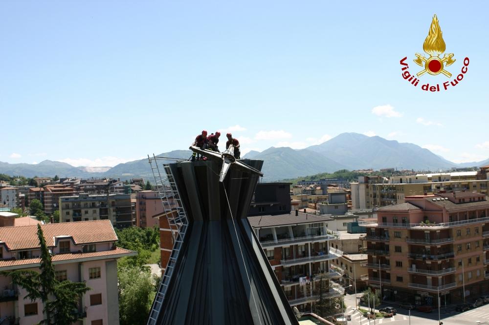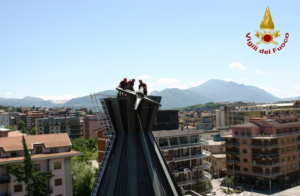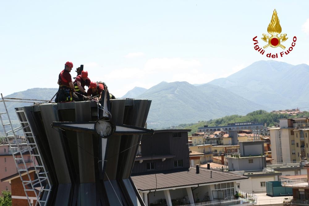 AVELLINO – Non è stato semplice, questa mattina, portare a termine l’operazione di recupero della croce in ferro posizionata sulla cuspide della cupola della chiesa del Cuore Immacolato della Beata Vergine Maria, in viale San Francesco d’Assisi ad Avellino, ma la professionalità degli specialisti del nucleo Saf (speleo-alpino-fluviale) dei vigili del fuoco di Avellino, che hanno lavorato in stretta collaborazione con i componenti di una squadra della centrale operativa di contrada Quattrograna, ha consentito di portare a termine l’intervento senza pericolo per la pubblica incolumità. Intervento che si era reso necessario di fronte al rischio crollo della pesante croce, rischio accentuato dall’imperversare delle condizioni meteorologiche registrate nel corso della lunga stagione invernale.