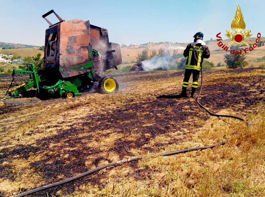 ZUNGOLI – Distrutta una macchina agricola che confeziona rotoballe di fieno andata in fiamme, nella mattinata di oggi, insieme con il trattore che la trainava, in un terreno di contrada Piano, in territorio del Comune di Zungoli. Oltre che al trattore l’incendio si è propagato in poco tempo alle sterpaglie ed ha lambito un vicino campo di grano. Per fortuna, comunque, che gli operai che vi lavoravano sono riusciti a mettersi in salvo in tempo. Sul posto è intervenuta una squadra dei vigili del fuoco del distaccamento di Ariano Irpino che prima ha provveduto allo spegnimento delle fiamme sui mezzi, poi di quelle di circa quattromila metri di sterpaglie. Messa in sicurezza l’intera zona.