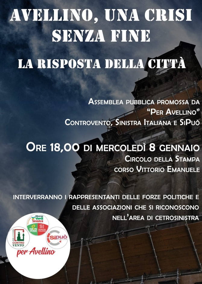 More images...Aggiornamento del 4 gennaio 2025, ore 10.26 - Avellino, una crisi senza fine. Assemblea pubblica al circolo della stampa - “Avellino, una crisi senza fine. La risposta della città” è il tema dell’assemblea pubblica che la coalizione “Per Avellino” – composta da “Controvento”, “SiPuò” e Sinistra Italiana – convoca per mercoledì 8 gennaio alle ore 18 presso il circolo della stampa in Corso Vittorio Emanuele.