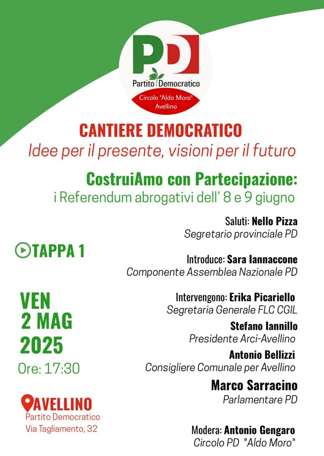 Su questi temi, venerdì 2 maggio, presso la sede del Pd irpino in via Tagliamento è in programma un incontro promosso dal circolo "Aldo Moro". Il programma dei lavori, che saranno moderati da Antonio Gengaro, prevede, dopo i saluti del segretario provinciale Nello Pizza e l’introduzione di Sara lannaccone, componente assemblea nazionale Pd, gli interventi di Erika Picariello, segretaria generale Flc Cgil, Stefano lannillo presidente Arci-Avellino, Antonio Bellizzi consigliere comunale per Avellino e Marco Sarracino, parlamentare Pd.